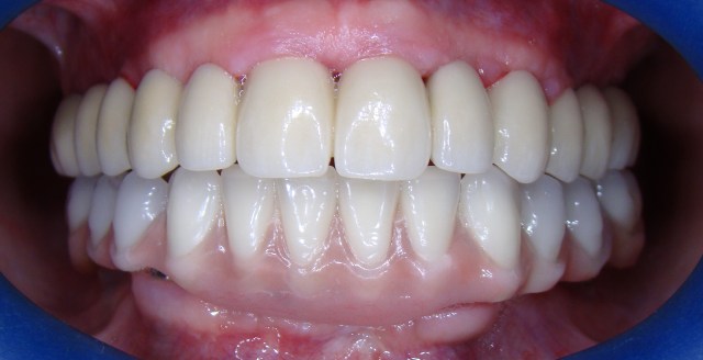 Neste caso a paciente apresentou a necessidade de remoção de todos os dentes naturais devido a perda óssea avançada (periodontite). Foi proposto e executado a reabiltação oral com implantes, sendo que na parte superior (maxila) foi desenvolvida uma prótese total fixa metelocerâmica (porcelana) e a parte inferior (mandíbula) foi reabilitada com prótese Fixa tipo Protocolo.